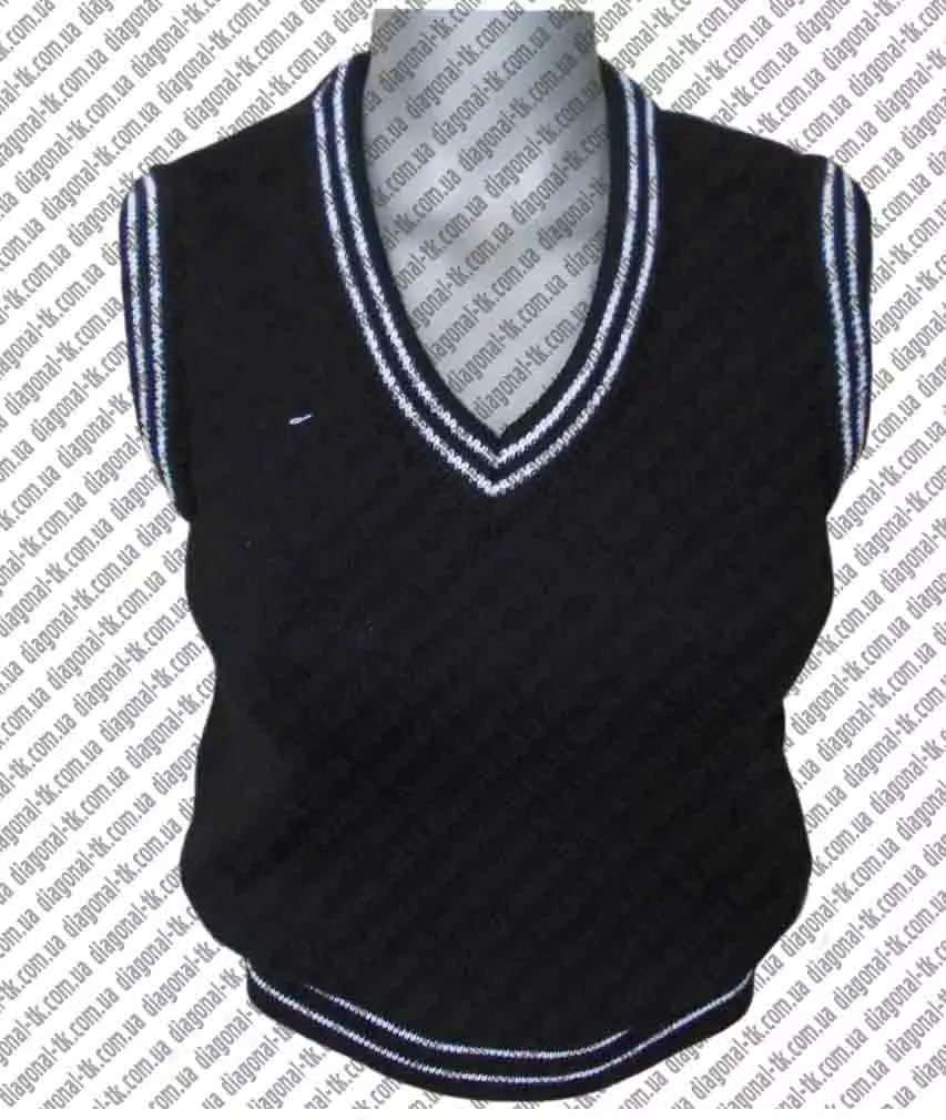 Жилет трикотажный для детей, учащихся в школе, лицее, гимназии. Многие, на этапе задумки одеть массово детей на каком-то этапе задаются вопросом: как сделать отличие между школьным жилетом для девочек и школьным жилетом для мальчиков? Мы с радостью Вам предоставим несколько вариантов. Первый - это обработка проймы и обработка горловины. Тойсь мальчикам можно сделать резинкой, девочкам - ажур. Второе - глубина самой проймы - кому-то глубже, кому-то выше. Третий вариант - это контрастная нить на резинке, пройме и горловине. К примеру жилет школьный трикотажный синий, черный хорошо сочетается с белой ниткой.